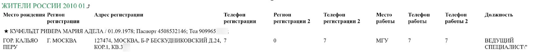 Хотя история с перуанским гражданством провалилась, руководство ГРУ поленилось придумывать новую легенду (вероятно, не подозревая, что перуанское правительство обнародует эту информацию). Как бы то ни было, свой первый российский паспорт «Мария Адела» получила в 2006 году, использовав точно такое же имя и дату рождения. Согласно созданному для нее прикрытию, она работала «ведущим специалистом» в МГУ и проживала по адресу в Москве, где, как нам удалось установить, на самом деле проживали другие люди, не подозревавшие о ее существовании.