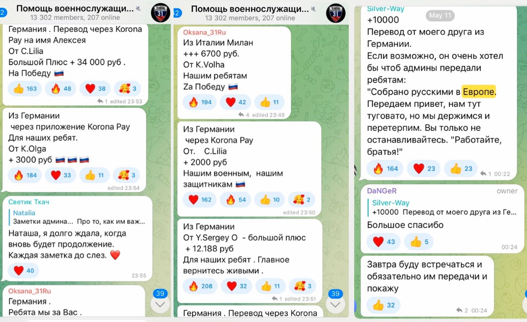 Многие россияне за границей предпочитают помогать финансово российским военным, участвующим в боевых действиях в Украине, а также боевикам «ЛНР» и «ДНР». Переводы из стран ЕС волонтерам с картами банков РФ осуществляются в тематических группах в Telegram. Собранные деньги идут на дорогостоящее оборудование, которым Минобороны не обеспечивает российских солдат: коптеры, прицелы и тепловизоры. Больше всего переводов из Германии, затем следуют Италия и Испания. Сколько всего людей участвуют в такой благотворительности, подсчитать сложно, так как сбор средств происходит нерегулярно, группы чаще всего закрытые. Иногда деньги собирают на европейский счет, а затем отправляют один большой перевод в Россию.
