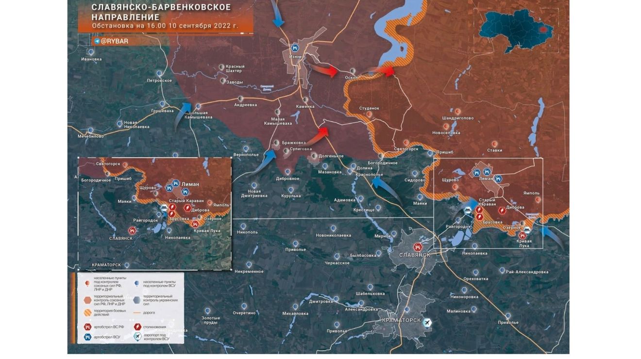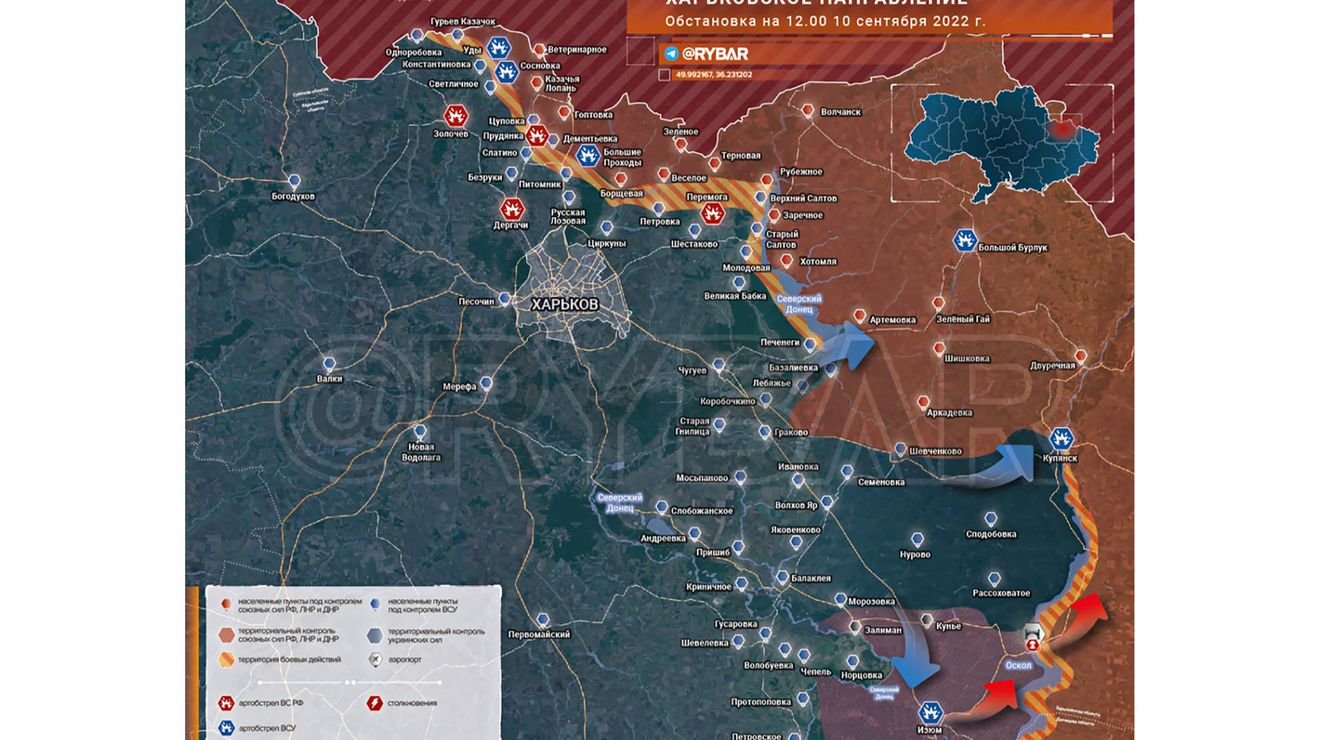 В пророссийском Telegram-канале «Vоенкор Котенок Z» дается сводка по итогам дня на Харьковском направлении. Согласно сообщению, по состоянию на 20:18 московского времени 10 сентября западная часть Купянска занята ВСУ, в восточной части города действуют украинские ДРГ, Изюм оставлен ВС РФ, но пока не занят украинцами. На южном фланге российской группировки, в районе Лимана и Ямполя, продолжаются бои.