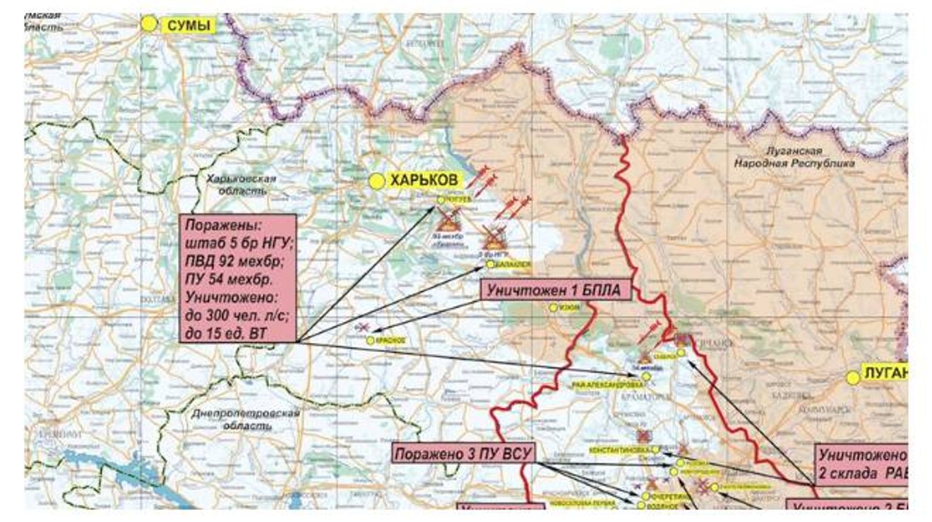 В сегодняшней оперативной сводке Минобороны РФ приводится карта, которая, в лучшем случае, отражает положение на Харьковском направлении несколько дней назад.
