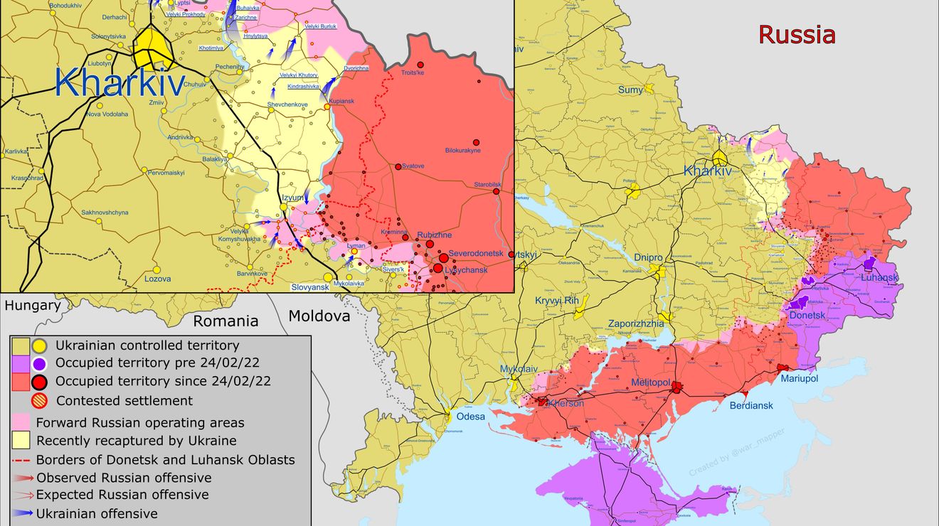 Польский военный аналитик Конрад Музыка считает, что ВСУ заняли почти всю Харьковскую область или сделают это в ближайшее время. Зафиксированный объем потерь ВС РФ в технике практически исключает вероятность организации российского наступления на этом направлении в среднесрочной перспективе. Украинские войска, напротив, имеют возможность развивать успех в Луганской области.