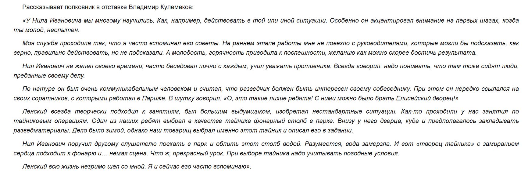 Но это еще не все: и Ханс де Гейтере, и сам Скворцов имели тесные связи с Владимиром Кулемековым, который не только не скрывает своего ГРУшного прошлого, но даже и гордится им. Вот, к примеру, отрывок, где он вспоминает о своих похождения в военной разведке: