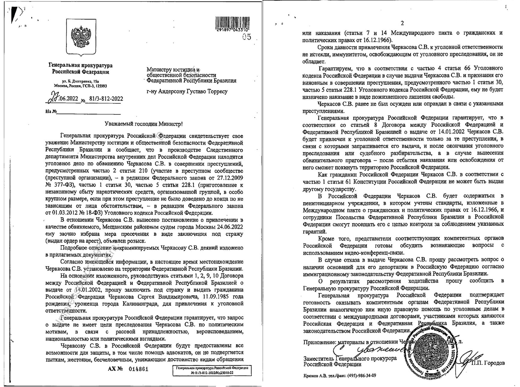 Первоначально Россия обратилась к министру юстиции Бразилии с запросом об экстрадиции Черкасова 27 июня 2022 года, через месяц после вынесения ему приговора в Бразилии. В запросе, подписанном заместителем главного прокурора России Городовым, утверждается, что ему было предъявлено обвинение Московским районным судом 24 июня 2022 года (за три дня до отправки письма) по обвинению в торговле наркотиками в составе организованной преступной группы. В письме прокурор уверяет, что после экстрадиции Черкасов не будет преследоваться по политическим мотивам, ему будет предоставлена полная защита российского законодательства, а в случае признания виновным он будет отбывать наказание в российском пенитенциарном учреждении.