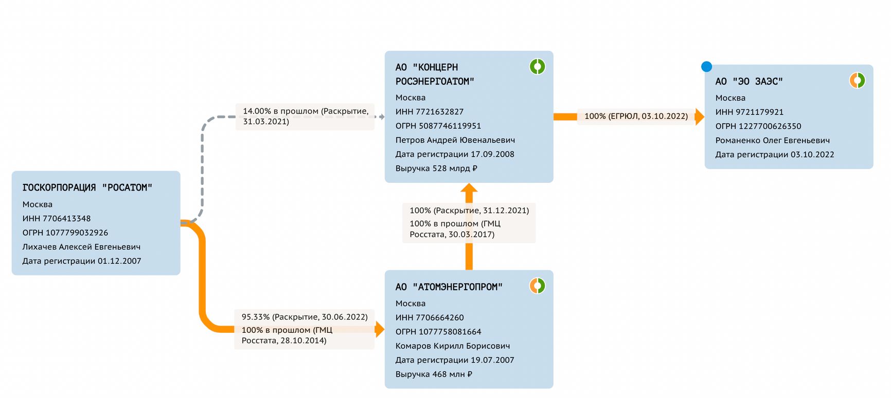 Упоминания эксплуатирующей организации нет в перечнях аффилированных лиц, хотя все ФГУП, как правило, на своих сайтах указывают, что являются предприятиями «Госкорпорации Росатом». Используется обтекаемая формулировка, согласно которой новая компания «пользуется поддержкой «Росэнергоатома»» — росатомовского топливного дивизиона. Тем не менее именно «Росатом» напрямую управляет станцией: единственный учредитель ЭО «ЗАЭС» — «Росэнергоатом», ему принадлежит 100% акций эксплуатирующей организации. Материнская компаниия «Росэнергоатома» — АО «Атомэнергопром», которая в свою очередь принадлежит «Росатому», о чем даже говорится на официальном сайте. ЭО «ЗАЭС» была зарегистрирована 3 октября, то есть еще за два дня до подписания официального указа Владимиром Путиным о принятии в федеральную собственность объектов ЗАЭС.