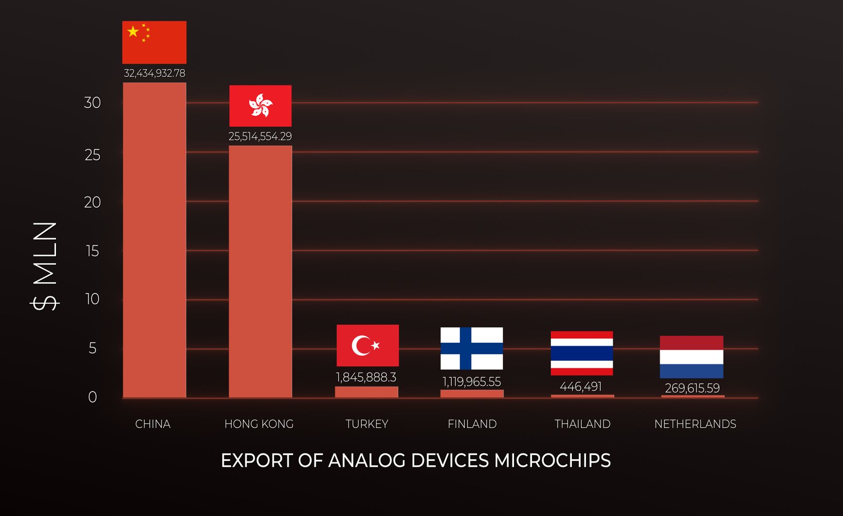 Основной объем американских микросхем поступил к российским импортерам через Китай и Гонконг, которые стали топовыми поставщиками брендов Texas Instruments и Analog Devices после начала полномасштабного вторжения.