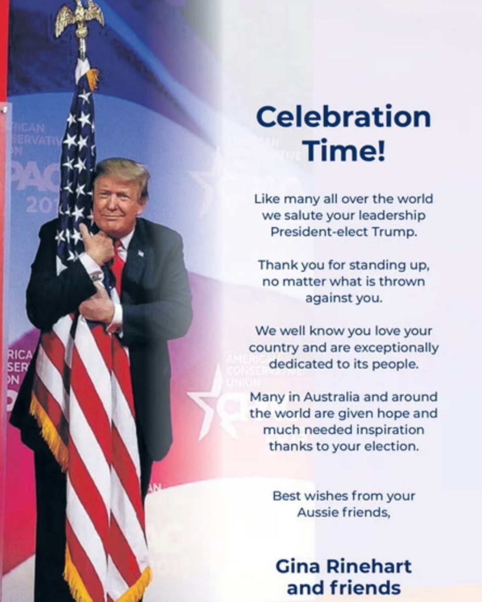 Джина Райнхарт впоследствии побывала на вечеринке Трампа по поводу его победы в Мар-а-Лаго во Флориде, а затем, вернувшись в Австралию, сделала несколько заявлений в поддержку политики нового американского лидера в интервью Sydney Morning Herald. Миллиардерша заявила, что хочет, чтобы Австралия «наблюдала и училась» у Трампа, как осуществлять «полный отказ от всей левой повестки».